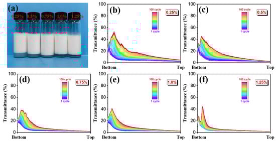 (a) Digital photos of AKD emulsions statically stored for 72 h at room temperature; (b–f) transmittance profiles of AKD emulsion—0.25%, AKD emulsion—0.5%, AKD emulsion—0.75%, AKD emulsion—1.0%, and AKD emulsion—1.25% after centrifugation for 100 cycles at 4000 rpm.