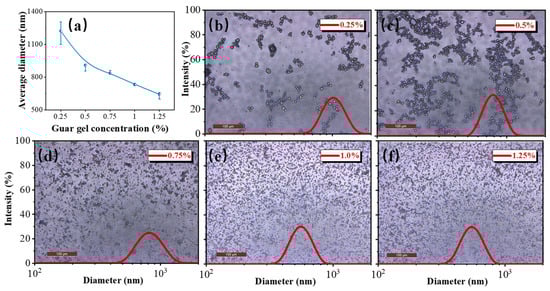 The droplet diameter and distribution of AKD emulsions are two important parameters for the application during lignocellulosic paper sizing. It is generally believed that AKD emulsions have a good sizing effect only when more than 90% of the droplets are smaller than 1 μm in diameter []. The average diameter and distribution of the AKD emulsion droplets are shown in Figure 4. All the emulsion droplets were spherical in shape, and the average diameter of the droplets decreased from 1223 to 642 nm with increasing guar gel concentration (Figure 4a). The droplets were smaller than those of the previously reported AKD emulsion without surfactant [,]. When the guar gel concentration was less than 0.75%, the AKD emulsion droplets tended to flocculate. As the guar gel concentration increased, the AKD emulsion droplets became more uniform and dispersed more evenly. More importantly, all the droplets were smaller than 1 µm, which is very beneficial for the sizing. Only when a sufficient amount of emulsifier is adsorbed on the oil–water interface can an emulsion with small droplets and a high specific surface area be obtained []. Furthermore, guar gel, dispersed in the aqueous solution, can lead to steric hindrance among the droplets, which favors improving the aggregate stability of the emulsion [].