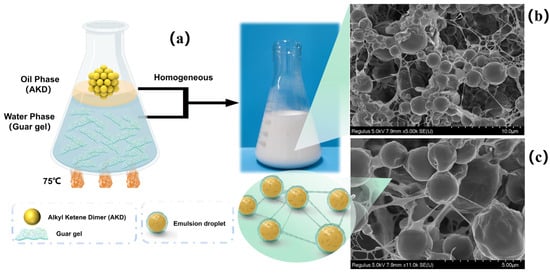A schematic diagram of the AKD emulsions is shown in Figure 5a. The mixture of aqueous guar gel and AKD oil were homogenized under high-speed shearing. During the emulsification process, the guar gel was broken into particles and adsorbed on the oil–water interface. After the external force was eliminated, the guar gel turned into an interface film due to its self-healing property, providing an ideal protective shielding for AKD droplets and improving emulsion stability []. The freeze-dried AKD emulsion—1.25% was observed by SEM. From the image in Figure 5c, a few particles smaller than 1 μm can be observed, which is because the large particles can be more clearly observed in the guar film coated on the surface of the particles, whereas the small particles can be easily destroyed by electron microscopy. As shown in Figure 5b,c, the guar gel tightly wrapped around the AKD droplets, forming spherical droplets with a smooth surface, which is beneficial for improving the emulsion stability and reducing droplet coalescence. Notably, there were connections between droplets, allowing the emulsion system to form a three-dimensional network structure. The network structure can improve the viscosity of the emulsion and effectively inhibit droplet coalescence, which is beneficial for improving emulsion stability [].