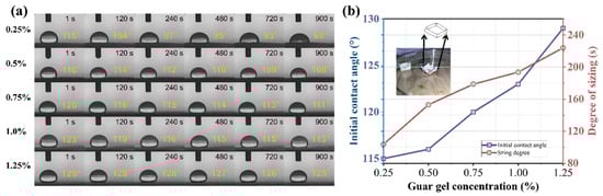 (a) Contact angle images of paper sized by AKD emulsions. (b) Effect of the guar gel concentration on the sizing degree and initial contact angle of the paper.