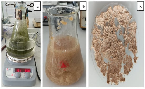 To extracted cellulose from algae species Ulva lactuca, 10 g of algae was introduced into a solution of ethyl alcohol []. The extraction was performed in a water bath with weak magnetic agitation (800 rot/min) at 65 °C in an Erlenmeyer flask with a ground glass stopper for 48 h (Figure 1a). The extractant was an ethanol/water mixture of various concentrations (90% and 60%, respectively). NaCl was also added in various concentrations 2 g/L and 4 g/L [,].
