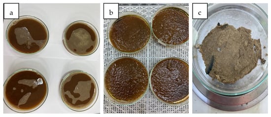 In order to obtain the extracted cellulose membranes and to swell them, the following steps were followed. A solution of 150 mL containing 10% w/w NaOH and 5% of thiourea was prepared. In the alkaline solution, cellulose powder from algae was added at a concentration level between 7 and 10% by mass. The systems were kept under controlled agitation conditions and at a temperature of no more than 30 °C for a time of three hours. The slurry of cellulose in the alkaline solution was cooled at −10 °C for a period of 24 h. After observing the formation of cellulose gel in the alkaline solution, the cellulose gel was left to heat at room temperature (Figure 2a). We prepared 250 mL of slow acid solution with formaldehyde with which we washed the obtained membrane structure. We continued washing the membrane structure with distilled water until neutral pH was obtained (Figure 2b). The washed membranes were kept in distilled water with small formaldehyde concentration for a period of 24 h. The membranes were dried by water evaporation in a dehydrator at 70 °C for a period of 2 h, and after they were dried in a thermobalance at 100 °C (Figure 2c).