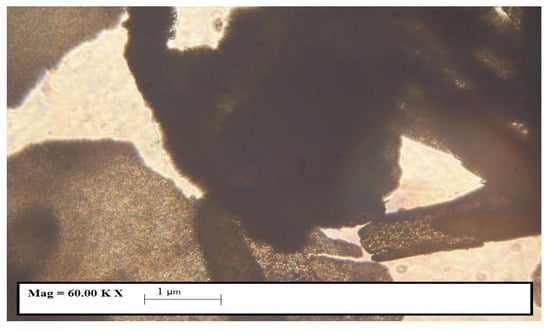 The species Ulva lactuca sp. was harvested fresh from seawater, washed with distilled water and cleaned of impurities []. The algae were placed for 48 h in an apparatus (fruit dryer) with 5 overlapping trays, where they dehydrated evenly. The temperature of the warm air flow circulating horizontally was set to 50 °C in order to not destroy the bioactive substances found in algae [,]. Subsequently, the dried algae were finely ground by mortaring and subjected to observation by transmission (Figure 1) under an IOR ML-4M optical microscope (60-fold magnification (eyepiece 10 × 60)).