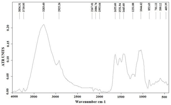 The FTIR spectra in the region 4000–400 cm−1 for Ulva lactuca species powder is shown in Figure 5. The large width of the band at 3283.60 cm−1 indicates the presence of functional group -OH. The lipids from the green algae structure were identified using the band at 2925.26 cm−1. A broad band in the 1800–1500 cm−1 range with a wavelength of 1635.60 cm−1 can include proteins and amides I from the protein structure. Also, the wavelength 1531.94 cm−1 indicates the presence of amides II in the protein structure. The peak at 1231.88 cm−1 shows the carboxylic group COO− and the characteristic band for phosphate P=O –esters. The presence of carboxylic acid and the –OH group is an indication of the presence of polysaccharides (especially cellulose), which is also confirmed by the peak at 1044.62 cm−1.