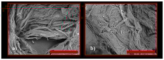 In Figure 4a,b, we can very clearly observe microfibers (even nanofibers) but also certain cellulose structures.