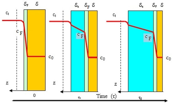 The major difficulties of these models are represented by the problem of time dependence of the diffusion frontiers. They can create serious problems for the transposition of numeric models. If the diffusion rate of swelling media is much greater than the rate of moving of swelled interface towards the center of the membrane, then a pseudo-steady state can be assumed. In this case, the above model generates the following diffusion problems (Equations (16)–(18)).