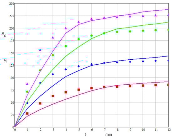 Dynamics of Ulva lactuca cellulose swelling degree of the model and experiment (line (model) red: 99% ethanol, blue: 80% ethanol, green: 60% ethanol, magenta: 40% ethanol; points (experimental) red: 99% ethanol, blue: 80% ethanol, green: 60% ethanol, magenta: 40% ethanol).