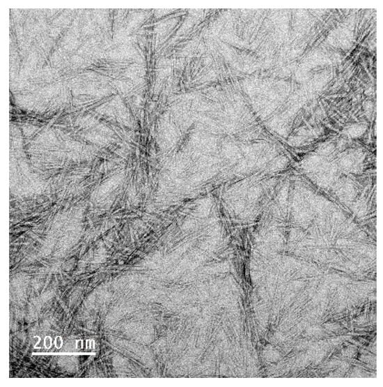 TEM image (Figure 1) shows that CNCs derived from soybean stover had a length of 117 ± 40 nm and width of 7.3 ± 2.0 nm. The average particle size, polydispersity index and zeta potential of soybean CNCs as measured by the Zetasizer was found to be 197 ± 6 nm, 0.65 and −50 ± 1 mV. The particle size result measured by the Zetasizer is slightly larger than that by TEM as the former measures the hydrodynamic diameter of CNCs. The particle size and zeta potential of soybean CNCs in this study closely align with values previously reported by other researchers [,,]. Typically, the length of CNCs vary from 100~250 nm up to several microns depending on the sources, and the width varies from 5 nm to 70 nm []. For instance, the length and width of CNCs prepared from soybean straw were 100~600 nm and 9.4 nm, respectively, based on TEM images []. The particle size of CNC can vary, which is attributed to disparities in the sources of cellulose materials and variations in preparation conditions []. The zeta potential of CNCs generated through sulfuric acid hydrolysis may fall within the range of −11 to −52 mV, contingent upon the specific preparation techniques employed and the salinity of the dispersion [,,].