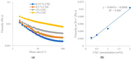 Viscosity characteristics of soybean-stover-derived CNCs. (a) Viscosity in relation to shear rates; (b) viscosity in relation to CNC concentration at a chosen shear rate (20 s−1).