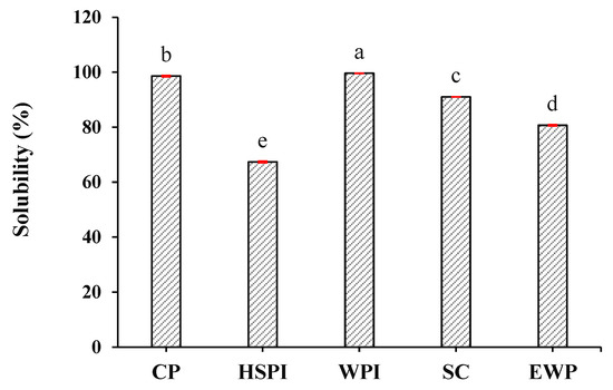 Solubility of selected proteins (collagen peptide (CP), hydrolyzed soy protein isolate (HSPI), whey protein isolate (WPI), sodium caseinate (SC), and egg white protein (EWP). Different letters (a, b, c, d, e) express the significant differences (p < 0.05).