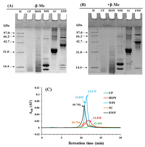 Non−-reduced (A) and reduced pattern (B) SDS−-PAGE profiles of selected proteins (collagen peptide (CP), hydrolyzed soy protein isolate (HSPI), whey protein isolate (WPI), sodium caseinate (SC), and egg white protein (EWP)); (C): size exclusion HPLC profiles of selected proteins. The number indicated the retention time of the peak.