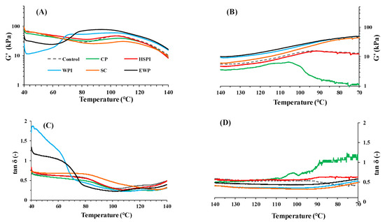 The changes in dynamic rheology of SPI-WG blends with varied soluble proteins during heating at 40–140 °C and cooling at 140–70 °C were monitored (Figure 3). The complex modulus (G′) of blends with CP, HSPI, and SC closely resembled the control blend at 40–85 °C, rising to varied extents at 85–110 °C before descending again at higher temperatures (Figure 3A). The value of tan δ decreased with increasing temperature at 85–110 °C and increased again at higher temperatures (Figure 3C). The increased G′ and reduced tan δ at 85–110 °C can be linked to increased molecular weight due to gluten polymerization reactions [6,25], with the control blend showing the highest enhancement in G′ at 85–110 °C. In the case of SC, its tan δ continued to decrease until 135 °C, which is probably due to the aggregation of SC at elevated temperature [26]. Blends with WPI and EWP displayed lower G′ than the control blend at 40–65 °C, but rapidly increased from 65 °C to 75 °C, then remained stable until approximately 110 °C before declining at higher temperature. Their tan δ decreased with increasing temperature and exhibited three stages at 40–65 °C, 65–75 °C, and 75–110 °C, respectively. At 65–75 °C, tan δ sharply decreased from >1 to <1, indicating gel formation due to heat-induced WPI and EWP denaturation [27,28].