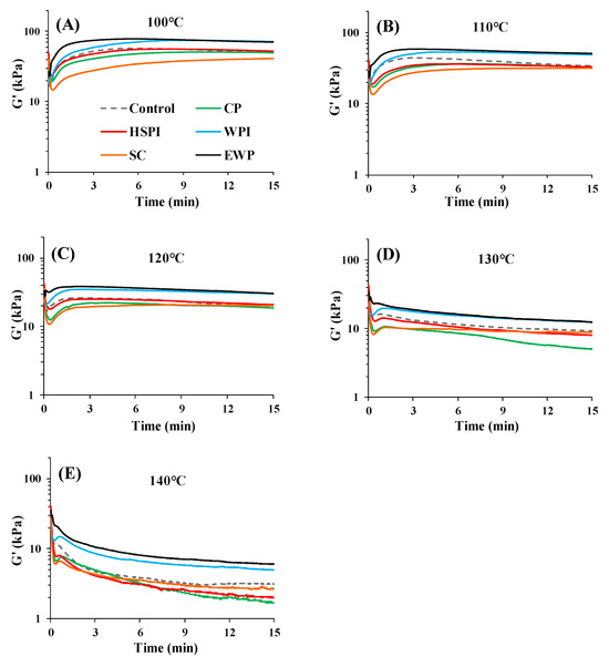 Time sweep measurements (80% strain, 10 Hz frequency) for SPI-WG blends with collagen peptide (CP), hydrolyzed soy protein isolate (HSPI), whey protein isolate (WPI), sodium caseinate (SC), and egg white protein (EWP) at various temperatures: (A) 100 °C, (B) 110 °C, (C) 120 °C, (D) 130 °C, and (E) 140 °C.