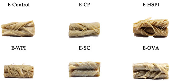 Structured materials were inspected visually by tearing and folding the edge portion of the extrudates. Figure 5 shows the macrostructure of folded extrudates without soluble protein (E-Control) and with different soluble proteins of collagen peptide (E-CP), hydrolyzed soy protein isolate (E-HSPI), whey protein isolate (E-WPI), sodium caseinate (E-SC), and egg white protein (E-EWP). Replacing partial wheat gluten (10% of total blend, dry base) with CP and HSPI yielded a highly fibrous structure with thin isolated fibers. E-Control, E-WPI, E-SC, and E-EWP materials exhibited a layered structure with few separated fibers.