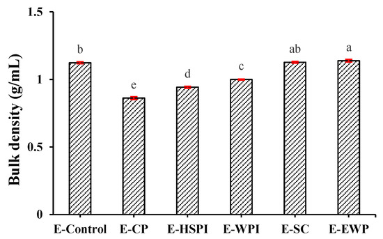 The bulk density of SPI-WG extrudate with varied soluble proteins (collagen peptide (E-CP), hydrolyzed soy protein isolate (E-HSPI), whey protein isolate (E-WPI), sodium caseinate (E-SC), and egg white protein (EWP)). Different letters (a, b, c, d, e) express the significant differences (p < 0.05).