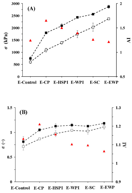 Tensile properties of SPI-WG extrudates deformed in parallel (black square) and perpendicular (white square) directions: (A) fracture stress, (B) fracture stress with without (E-Control) and with soluble proteins (collagen peptide (E-CP), hydrolyzed soy protein isolate (E-HSPI), whey protein isolate (E-WPI), sodium caseinate (E-SC), and egg white protein (EWP)). The ratio between the average of the parallel and perpendicular directions is a measure of anisotropy (AI, red triangles). The dashed lines guide the eye.