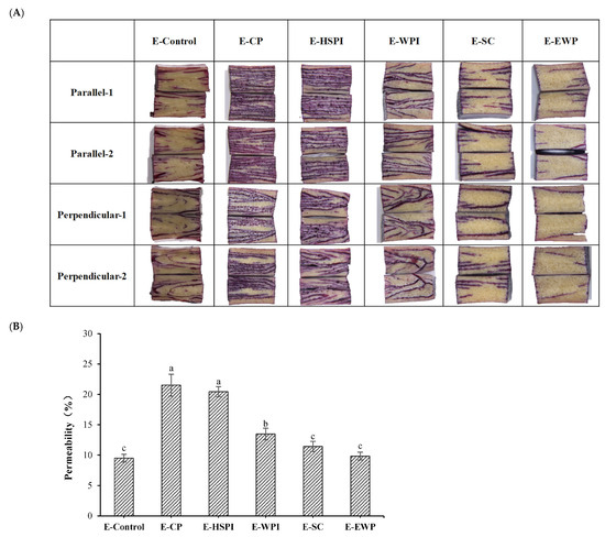 The distribution map (A) and permeability (B) of 0.5% cochineal red pigment into SPI-WG extrudates. Different letters (a, b, c) express the significant differences (p < 0.05).