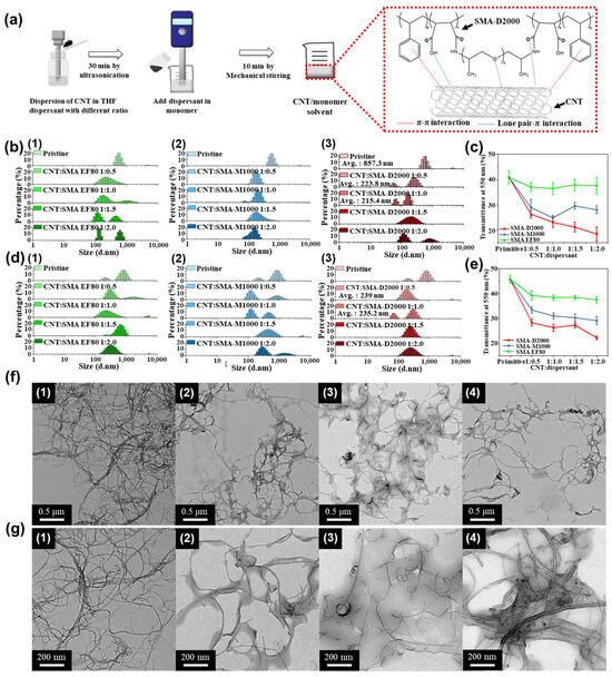 (a) Mechanism by which SMA-amide disperses CNTs. (b) Particle size analysis of the CNT/polymeric dispersant solutions on the 0th day: (1) SMA EF80, (2) SMA-M1000, (3) SMA-D2000. (c) Transmittance of the CNT/polymeric dispersant solutions at 550 nm on the 0th day. (d) Particle size analysis of the CNT/polymeric dispersant solutions on the 5th day: (1) SMA EF80, (2) SMA-M1000, (3) SMA-D2000. (e) Transmittance of the CNT/polymeric dispersant solutions at 550 nm on the 5th day. (f,g) TEM micrographs of CNT/polymeric dispersant solutions at different magnifications with (1) no dispersant, (2) SMA EF80, (3) SMA-M1000, and (4) SMA-D2000.