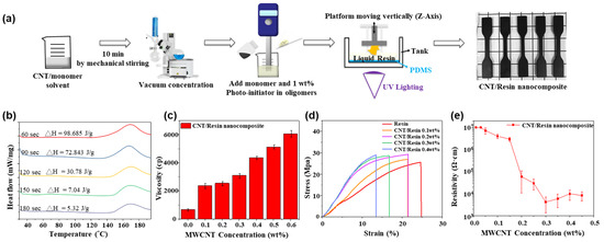 (a) Preparation of CNT/resin nanocomposites. (b) DSC analysis of CNT/resin nanocomposites with different photocuring times. (c) Resin viscosity versus CNT content. (d) Stress-strain curves of CNT/resin nanocomposites with different CNT contents. (e) Nanocomposite resistivity versus CNT content.