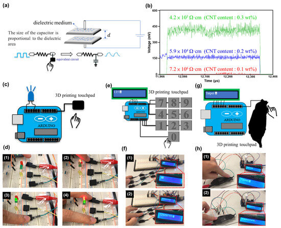 (a) Schematic of the capacitive sensor. (b) Effects of resistivity on the signal from the sensor. (c) Schematic of capacitive sensor connected to an LED. (d) Output of LED-connected capacitive sensor: (1) sensors not touched; (2) red LED touched; (3) green LED touched; (4) red and green LEDs touched at the same time. (e) Schematic of 3D-printed touchpad keyboard connected to LCD screen. (f) Output of touchpad keyboard: (1) capacitive sensor number ‘1’ touched; (2) result at the end of the test. (g) Schematic of 3D-printed map of Taiwan. (h) Output from touching the 3D-printed map: (1) result of touching the location corresponding to Taipei City; (2) result of touching the location corresponding to Kaohsiung City.