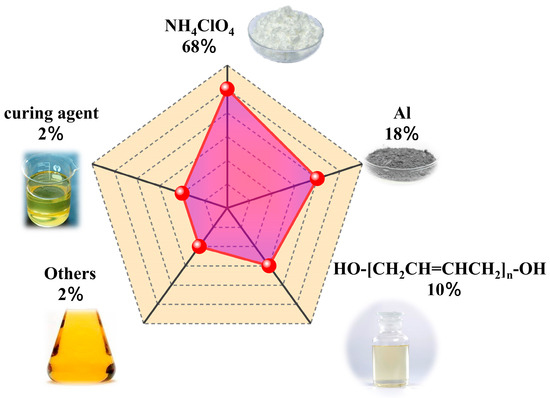 In this study, the research focused on a HTPB propellant with a solid content of over 70% [49,50,51,52,53], as shown in Figure 1. Experimental measurements were conducted to determine the flow-dependent performance parameters of the propellant slurry. These parameters were then used to simulate the casting process of the propellant slurry slab and to analyze the flow field characteristics during casting.