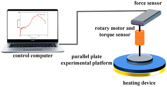 The rotational rheometer is commonly employed to measure the viscosity of the propellant at various shear rates. Experiments are conducted using parallel plates, with the distance between the plates being controlled at 2 mm. The experimental platform is maintained at a temperature of 50 degrees Celsius. The shear rate is treated as an independent variable, ranging from 0.01 s−1 to 3 s−1. The original diagram of the experimental setup is illustrated in Figure 2. Figure 3 is the physical diagram in the rheological test.
