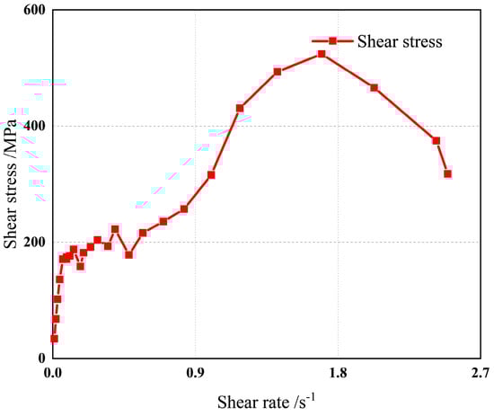 The point in the Figure 4 is the experimental data point. The shear stress corresponding to the first inflection point of the curve in the figure is the yield value of the propellant slurry, 180 MPa, as shown in Figure 4. A series of shear rates were selected to measure the viscosity of the slurry at a constant shear rate. The data obtained from the comprehensive experiment are fitted by the Herschel-Bulkley-Papanastasiou constitutive model, and the viscosity constitutive is obtained as follows. By observing the experimental data, it is demonstrated that the viscosity gradually decreases with the increase of the shear rate, and the viscosity changes greatly when the shear rate is small (that is, less than 0.2). When the shear rate is large (that is, greater than 0.2), the viscosity changes little and the viscosity is low—less than 1000 Pa · s.