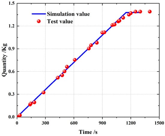 Observing the quantity comparison of the slurry in Figure 7, 1080 s is the planned stop pouring time, but the actual test value is less than the simulation value at 1080 s because of the loss. As the experiment is still pouring, the final experimental measurement quantity is greater than the simulation quantity. These reasons described above lead to the quantity of the experimental pouring slurry being slightly higher than the simulation quantity. Figure 7 lists the relevant data comparison. From a comparison between the time of the test and that of the simulation for completing the pouring, it is found that the time of the simulation to complete the pouring is slightly shorter than the time of the experiment to complete the pouring, and that the error of the simulation pouring time relative to the experimental pouring time is 8.08%.