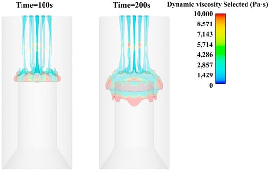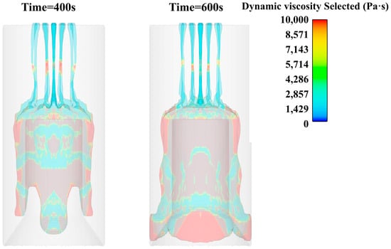 Viscosity cloud diagram of slurry pouring (100 s, 200 s, 400 s, 600 s).
