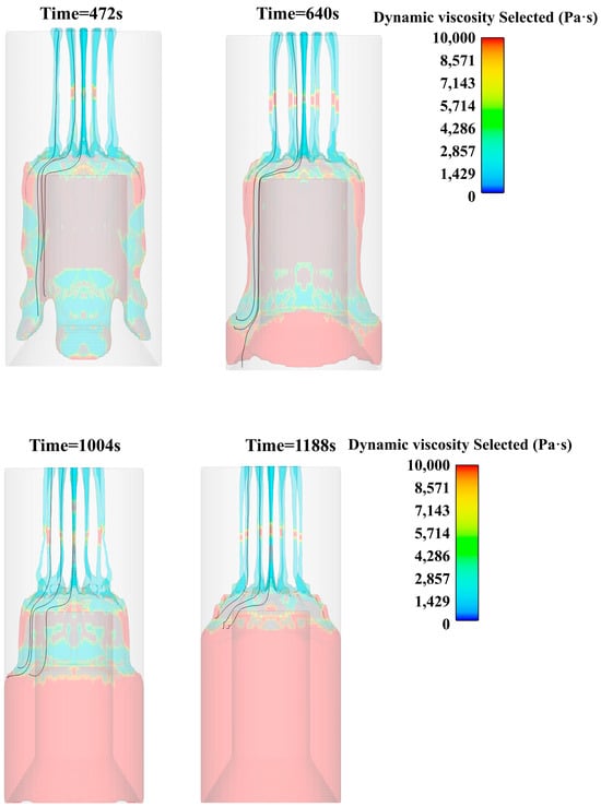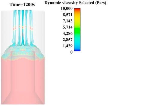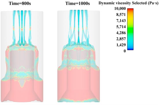 Viscosity cloud diagram of slurry pouring (800 s, 1000 s, 1200 s).