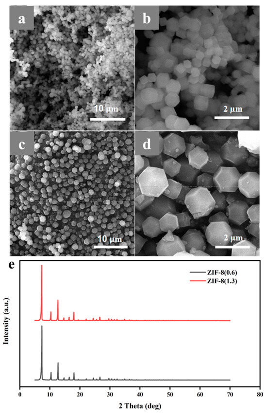 SEM images of (a,b) ZIF-8 (0.6) and (c,d) ZIF-8 (1.3), (e) XRD curves of ZIF-8 (0.6) and ZIF-8 (1.3) powder.