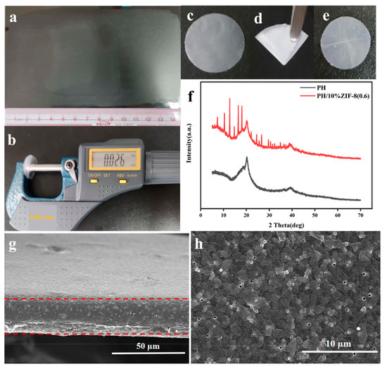 (a) Digital photos of macro scale PH/10%ZIF-8(0.6) membrane and (b) thickness measurement of PH/10%ZIF-8(0.6) membrane, (c) Digital photos of free-standing PH/10%ZIF-8(0.6) membrane and (d,e) bending PH/10%ZIF-8(0.6) membrane, (f) XRD curves of PH and PH/10%ZIF-8(0.6) membrane. (g) Cross-section and (h) surface SEM images of PH/10%ZIF-8(0.6) membrane (The red dashed line represents the cross-sectional boundary of the membrane).
