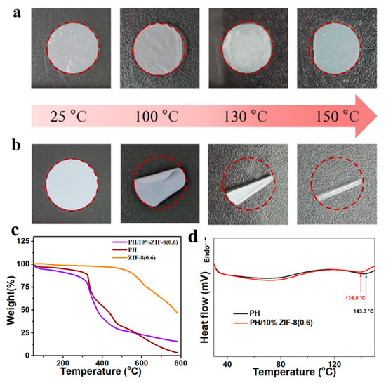 Thermal shrinkage of (a) PH/10%ZIF-8(0.6) membrane and (b) PP membrane after heating at different temperatures. (c) TGA curves of PH/10%ZIF-8(0.6) membrane, PH membrane and ZIF-8(0.6). (d) DSC curves of PH/10%ZIF-8(0.6) and PH membrane.