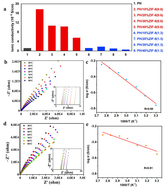 (a) The ionic conductivity of PH membrane, PH/x%ZIF-8(1.3) membrane and PH/x%ZIF-8(0.6) membrane at 30 °C. Impedance spectra of (b) PH/P membrane and (d) PH/10%ZIF-8(0.6)/P membrane at temperature of range 30–90 °C (inset: enlarged impedance spectra). The ionic conductivities of (c) PH/P membrane and (e) PH/10%ZIF-8(0.6)/P membrane as a function of temperature. The plots represent the experimental data and the solid lines represent fitting results.