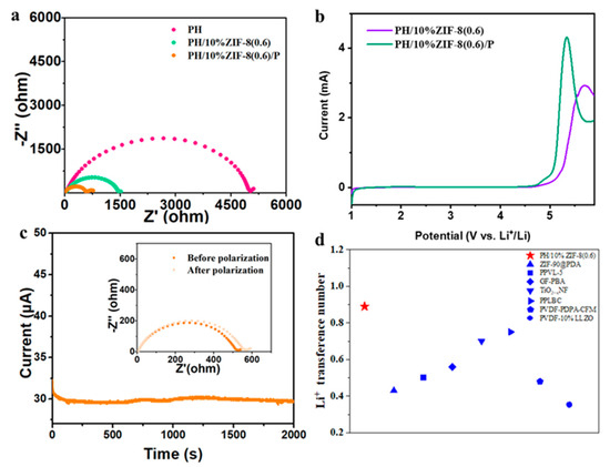 Li/Li symmetric cells based on different solid-state electrolytes were assembled to investigate the electrolyte/electrode interface reaction impedance (Rct). As shown in Figure 6a, compared to PH, the Rct of PH/10%ZIF-8(0.6) was 1460 Ω, which was much lower than that of PH (5000 Ω). After introducing a small amount of plasticizer, Rct of PH/10%ZIF-8(0.6) was as low as 560 Ω, demonstrating the interfacial compatibility of PH/10%ZIF-8(0.6)/P had significantly improved. The electrochemical stability window, as one of the important parameters of the electrolyte, can directly affect the matching of the positive electrode active material, thereby indirectly affecting the energy density of the battery. We assembled a series of Li/SS asymmetric batteries using FEC, PH/P, PH/10%ZIF-8(0.6), and PH/10%ZIF-8(0.6)/P as electrolytes, with Li metal and SS as counter electrodes and working electrodes, and conducted linear sweep voltammetry (LSV) testing at room temperature. The corresponding LSV curves are shown in Figure S3 and Figure 6b, the electrochemical stability window of pure FEC and PH/P was 4.6 V and 4.65 V, respectively. After introducing ZIF-8(0.6), the electrochemical stability window of the PH/10%ZIF-8(0.6) and PH/10%ZIF-8(0.6)/P was 5.0 and 4.7 V, indicating PH/10%ZIF-8(0.6)/P still had excellent electrochemical stability after the introduction of plasticizer. Our PH/10%ZIF-8(0.6)/P can match high-voltage cathodes, such as ternary NCM811 and LiCoO2. The high lithium-ion transference number (tLi+) can effectively alleviate the polarization effect of the electrolyte, thereby inhibiting the nucleation of lithium dendrites and slowing down the growth of lithium dendrites, thereby improving the cycle performance of LMBs. The chronoamperometry profile and the initial/steady-state EISs of Li/Li cell with solid state electrolytes are presented in Figure 6c and Figure S4, the value of tLi+ for PH/10%ZIF-8(0.6)/P was evaluated to be 0.89, which was much higher than those of PH/P (0.35) and PH (0.3). The excellent tLi+ of PH/10%ZIF-8(0.6) could be attributed to the unique 3D porous nanonetwork and rich ZnO groups in ZIF-8, which limit the movement of TFSI− via chemical interaction and therefore promote mobility of Li+. It is worth noting that the tLi+ of our PH/10%ZIF-8(0.6)/P is also obviously higher than those of reported SEs [21,34,35,36,37,38,39] (e.g., 0.75 for PPLBC, 0.48 for PVDF-PDPA-CFM, 0.353 for PVDF-10%LLZO) (Figure 6d).