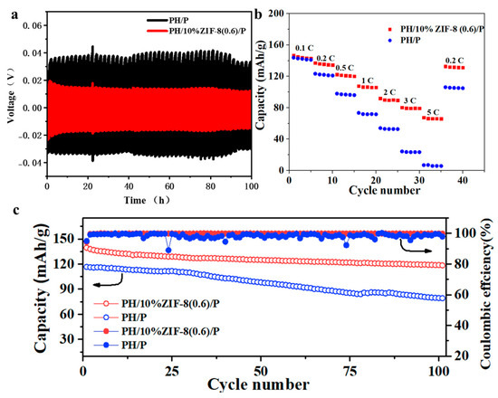 (a)Voltage-time profiles of Li/Li symmetric cells with PH/P and PH/10%ZIF-8(0.6)/P at 0.1 mA cm−2 and 0.1 mAh cm−2. (b) Rate performance of Li/LFP cell with PH/P and PH/10%ZIF-8(0.6)/P. (c) Cycling performance of Li/LFP cell with PH/P and PH/10%ZIF-8(0.6)/P at 0.5 C.