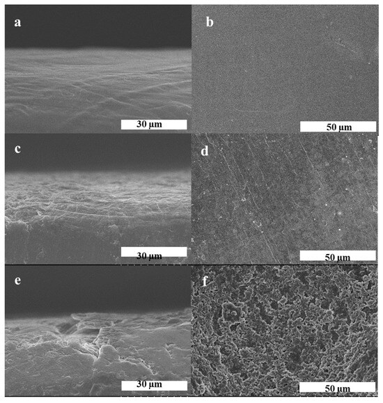 SEM images for the surface and transverse section of (a,b) the pristine Li electrode before galvanostatic cycles, and the Li electrodes obtained from the Li/Li symmetric cells with (c,d) PH/10%ZIF-8(0.6)/P and (e,f) PH/P after 50 cycles at 0.1 mA cm−2.