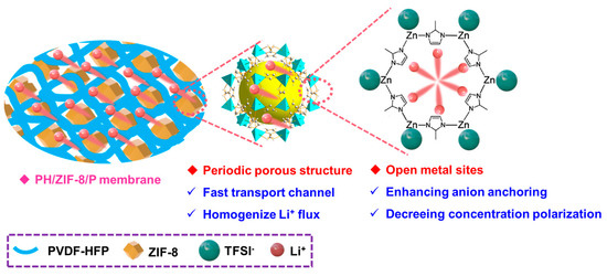 Schematic illustration for the architecture of the self-standing quasi solid composite polymer electrolytes (e.g., PH/10%ZIF-8(0.6)/P) membrane with a magnification showing nano-channels of ZIF-8. The migrating Li+ are highlighted by the stretched red spheres.