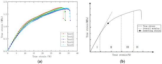(a) Experimental true stress-true strain curve; (b) definition of dewetting strain.