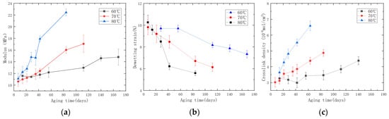 (a) Line chart of the relationship between the modulus and aging time; (b) line chart of the relationship between dewetting strain and aging time; (c) line chart of the relationship between crosslink density and aging time during the accelerated aging process.