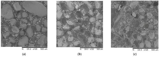 With the aging of PFPCs, chain scission and chain crosslinking occur constantly, and the chemical structure of the polymer matrix changes. Crosslink density is an important index to characterize the degree of crosslinking of polymers. In this study, a balanced swelling method was used to measure the crosslink density of aging specimens []. The obtained results are shown in Figure 3c. As the aging time increases, there is a noticeable increase in crosslink density. To visually observe the impact of aging time on particle dewetting, we extracted block-shaped specimens measuring 10 mm × 10 mm × 4 mm from the fracture and side surfaces of the PFPC specimens after the tensile tests. These samples underwent vacuum drying and conductive coating treatment. Surface morphology observations were conducted using a TM3000 (Hitachi, Tokyo, Japan) scanning electron microscope. The SEM images of the tensile fracture surface of the PFPC specimens are shown in Figure 4. From left to right, the samples shown are unaged, aged at 80 °C for 42 days, and aged at 80 °C for 84 days. It can be obviously found that the volume fraction of particles in the PFPC specimens is high, which can reach about 70%. With the increase in aging time, the particles are more easily pulled off under a tension load, and more holes are left by interface debonding. This phenomenon indicates that with the increase in aging time, the strength of the particle/matrix interface decreases.