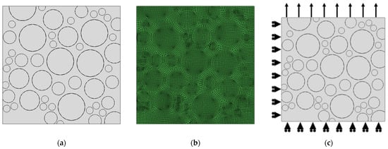 (a) Random particle-filling model; (b) quadrilateral mesh division with a size of 0.02 mm; (c) uniform displacement boundary condition.