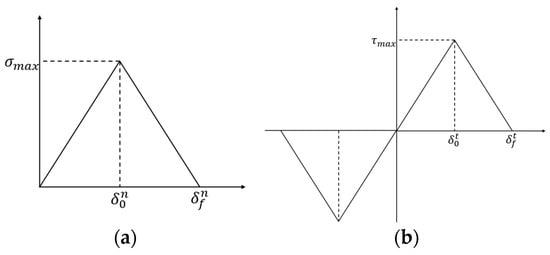 The constitutive relationship of the CZM is shown in Figure 6, which can be illustrated with Equations (1) and (2):