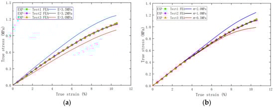 The elastic modulus of the particles was chosen as 32.5 GPa [], and the effect of aging on the modulus of the particles was disregarded. The modulus of the matrix and the strength of the CZM were determined by fitting the FEA results to the test results, as shown in Figure 7. It can be seen that the influence of the matrix modulus is mainly reflected in the elastic stage of the results, while the influence of the interface strength is mainly reflected in the interface debonding stage. The modulus of matrix () and the strength of the interface were determined as 2.3 MPa and 1.11 MPa, respectively, for the unaged PFPC specimens.