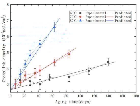 By substituting the parameters in Table 3 into Equation (7), a predictive model for the crosslink density of PFPC materials was obtained. The comparative diagram of experimental/predicted crosslink density is shown in Figure 8.