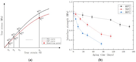 Five points at equal intervals under the dewetting strain were taken as reference data, as shown in Figure 10a. The initial interface strength is chosen based on the stress values corresponding to the dewetting strain obtained from the experimental stress–strain curve. Then, we adjusted the interface strength value with an increment of 0.01 to achieve the minimum value of the MSE. The interface strength under different aging temperatures and aging times was obtained through the simulation. With the increase in aging time and aging temperature, an obvious decrease in interface strength can be observed, as shown in Figure 10b.