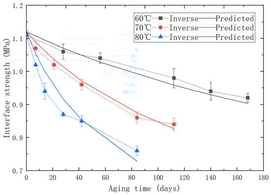 The values of α and β can be obtained from the fitting results of the power function, which are: , and the remaining values can be referred to Table 3. The comparative diagram of the inverse/predicted interface strength is shown in Figure 12. According to calculations, the value of the predictive model for interface strength is 0.90, which indicates that the predictive model has an acceptable accuracy and reliability. By substituting the parameters into Equation (13), a multiscale predictive model for the interface strength of aged PFPCs is obtained: