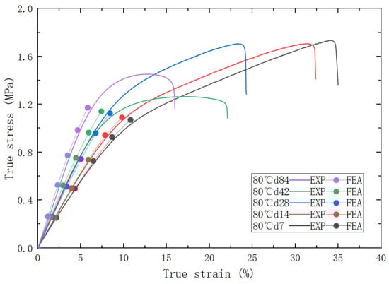 In order to further verify the reliability of the predictive models, the matrix modulus and interface strength at various aging temperatures and aging times were calculated according to the predictive models and used as parameters of the RVE model for simulation. The comparison of stress–strain curves between the simulation and experiments under accelerated aging conditions at 80 °C is shown in Figure 13.