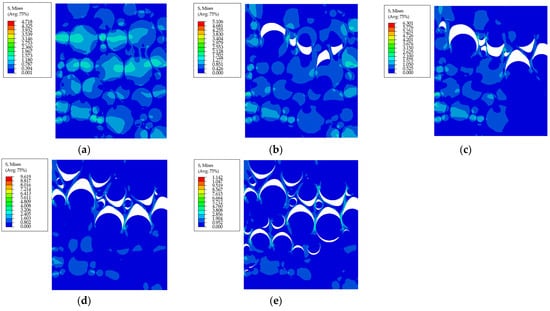 It can be seen that the matrix modulus increases with the aging time, which leads to greater von Mises stress in the RVE. Under the same load level, the interface between the particles and matrix was well bonded for the RVE, with aging properties of 80 °C for 7 days (Figure 14a). However, for the RVE with aging properties of 80 °C for 14 days, debonding occurred between the large particles and matrix (Figure 14b). With the increase in aging time, the interface strength decreased continuously, and more particles were debonded under the same load level (Figure 14c–e).