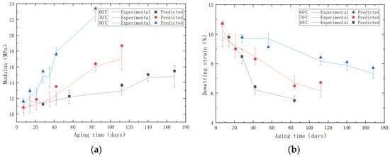 Through the analysis of the output stress–strain curves, we derived and compared the predicted variations in the modulus and dewetting strain with aging time against the experimental results. The comparison results are shown in Figure 15. The predicted data can be observed to have a similar changing trend as the experimental data. By calculation, the values for the modulus and dewetting strain are both 0.94, which verifies the reliability of the predictive models.